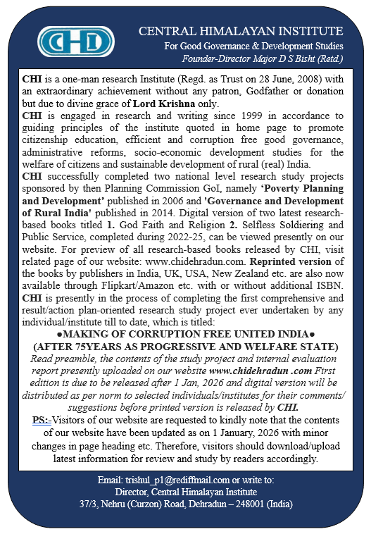 From Maj D.S. Bisht (Retd.) Director, CHI